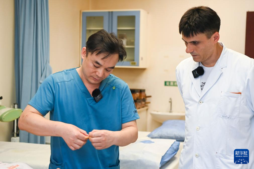 在南宁市广西国际壮医医院,莫小龙(右)向医生廖炼炼学习针灸知识(7月4日摄)。