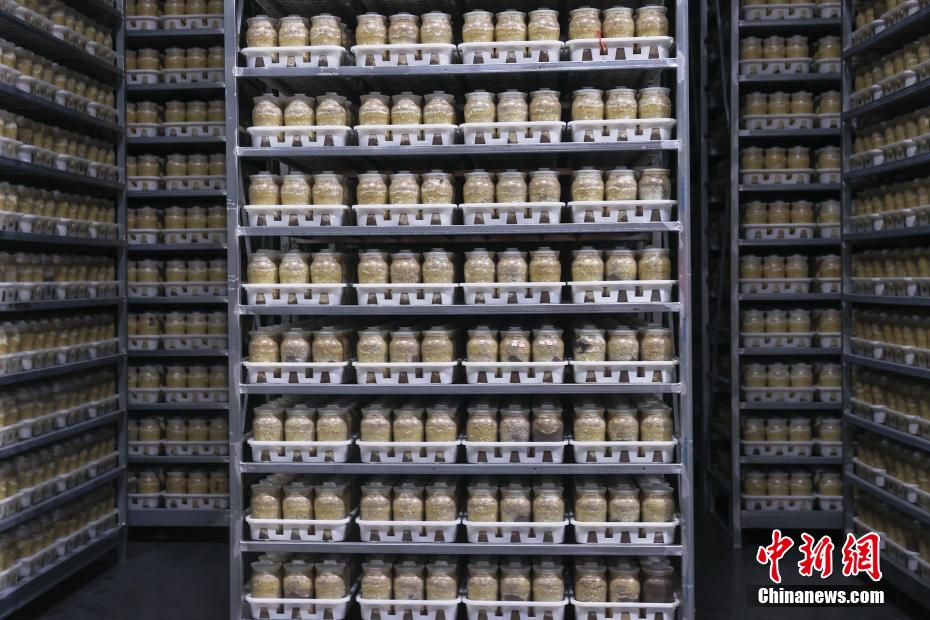 智能养菌房内,一层层菌瓶整齐摆放,该工厂的每一个养菌房内都装有温控、湿控、光控等设备,保证培养基在最佳环境中生长培养。中新网