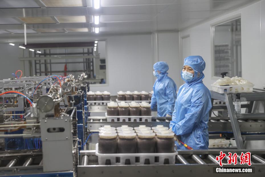工厂的自动化流水线把已经开瓶搔菌的成熟菌瓶传送至菌瓶架上摆放。中新网