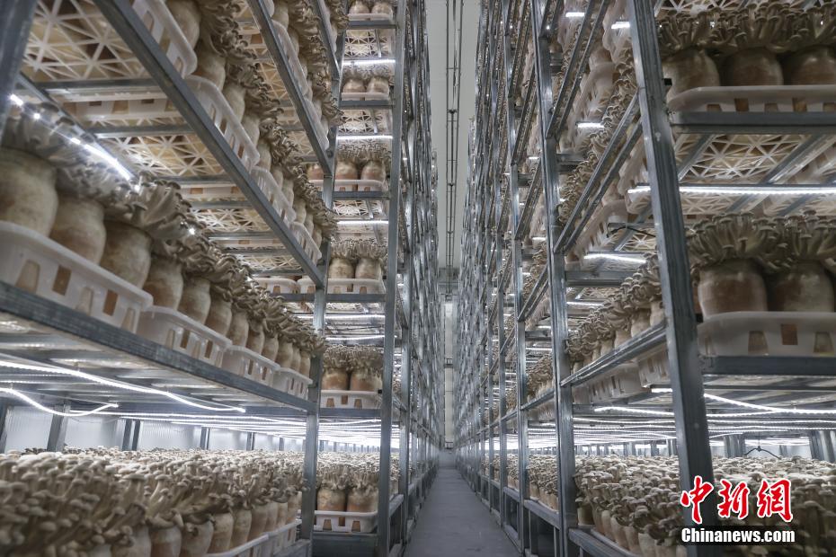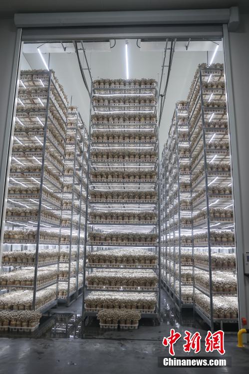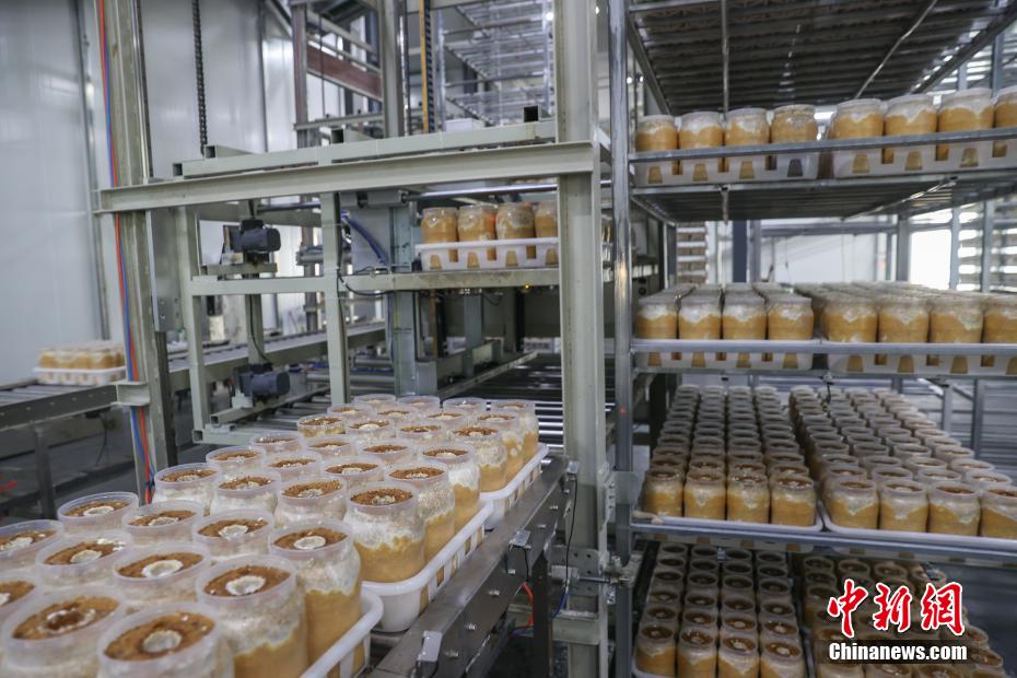 智能化菇房内,一朵朵菌菇生长旺盛。该工厂的每一个出菇房内都装有温控、湿控、光控等设备,菌瓶入房后,不需要人工干预,全部由智能化系统调控各项参数,确保菌菇在最合适的环境下生长。中新网