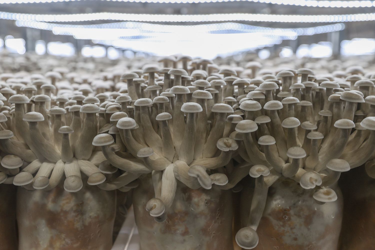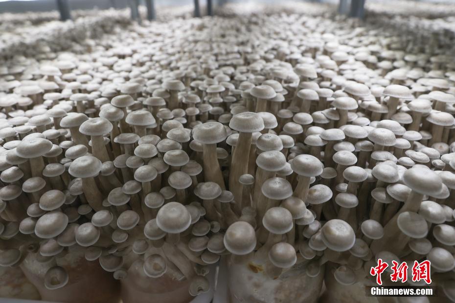 智能出菇房内,一朵朵菌菇生长旺盛。该工厂的每一个出菇房内都装有温控、湿控、光控等设备,菌瓶入房后,不需要人工干预,全部由智能化系统调控各项参数,确保菌菇在最合适的环境下生长。中新社