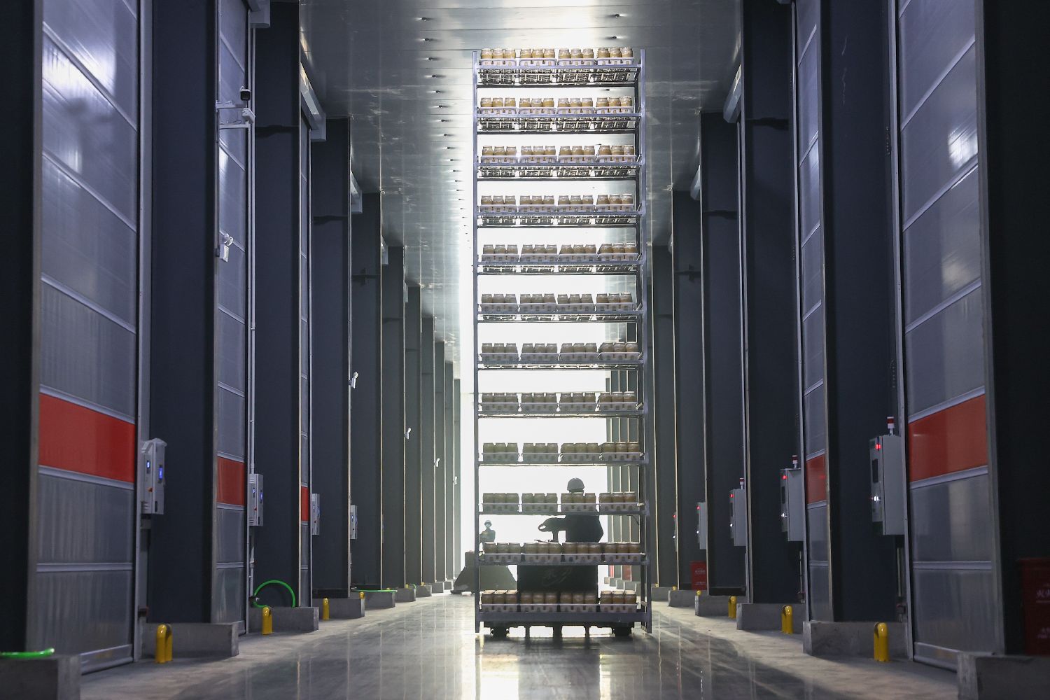 智能出菇房内,一层层菌瓶整齐摆放,该工厂的每一个出菇房内都装有温控、湿控、光控等设备,菌瓶入房后,不需要人工干预,全部由智能化系统控制各项参数。中新网