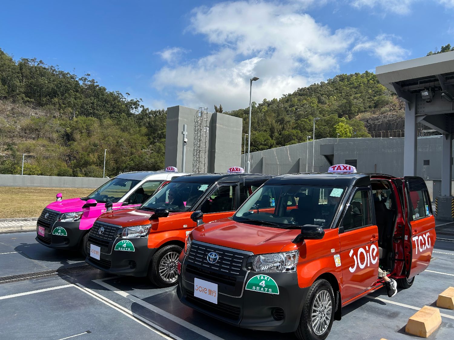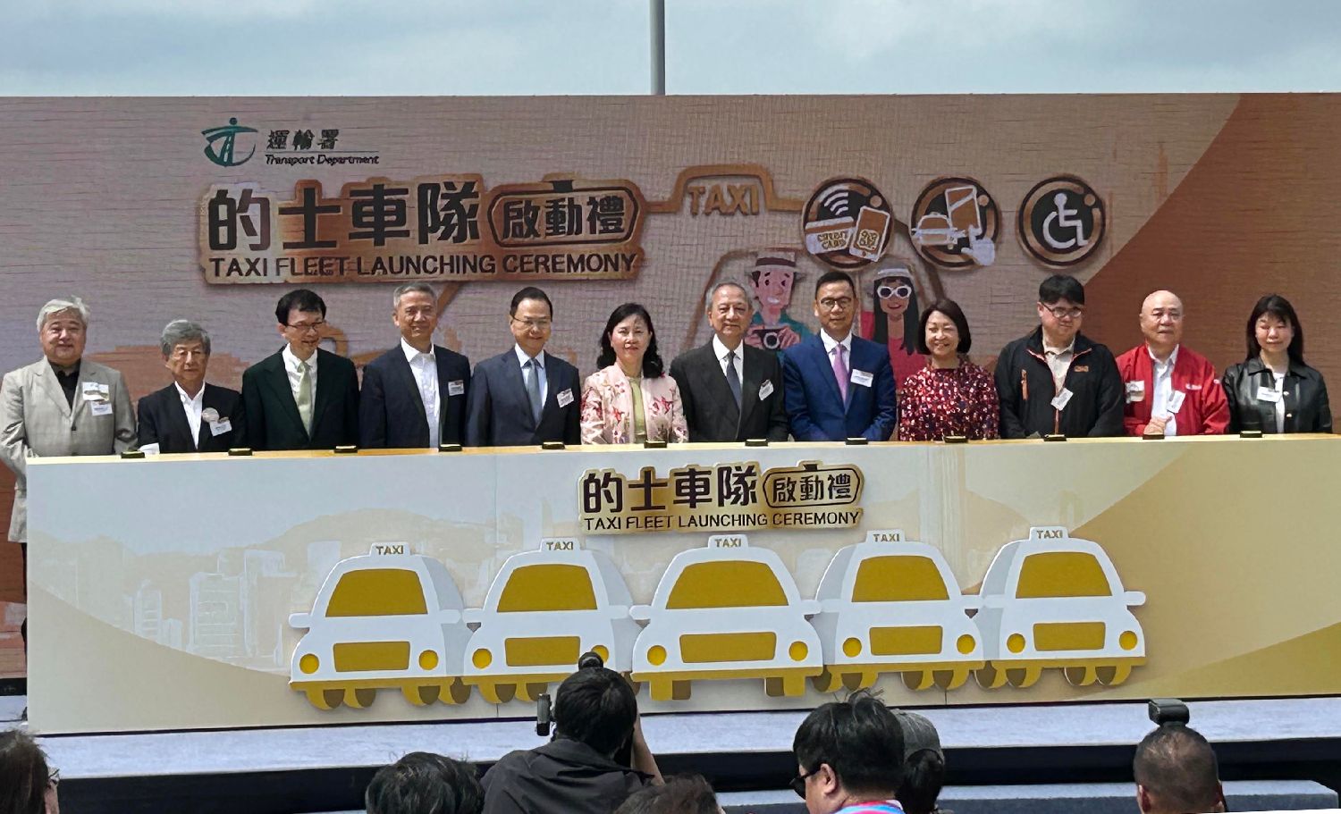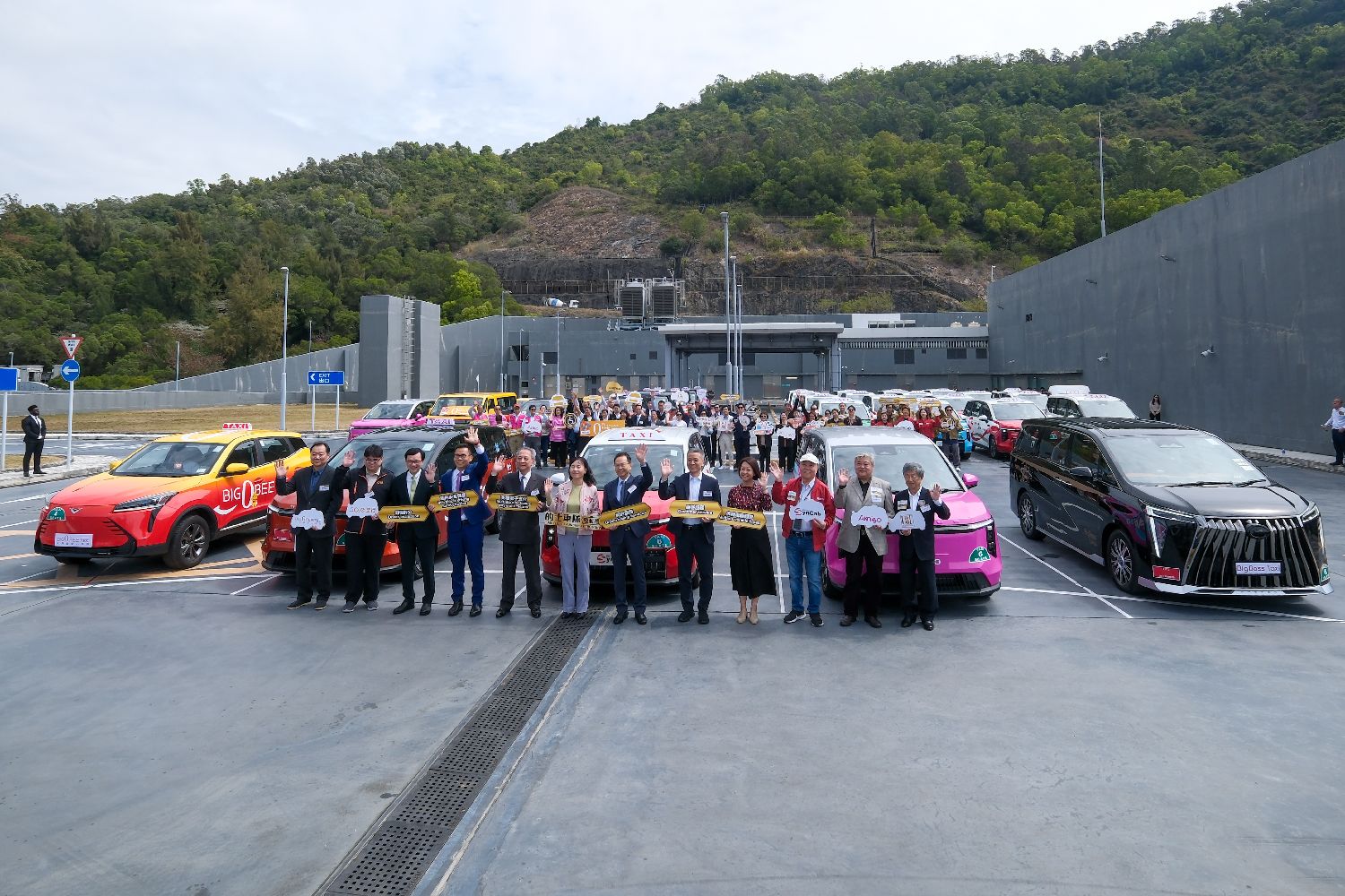 3月3日,香港的士车队启动礼在青衣运输署车辆检验综合大楼举行。5支的士车队共提供超过3500辆的士,占全香港的士近两成,各车队由3月底起至7月陆续投入服务。各车队均会提供电动的士、轮椅的士和豪华的士供乘客选择,以推动绿色运输发展,并照顾不同人士的出行需要。图为出席启动礼的嘉宾与“的士车队”合影。中新社