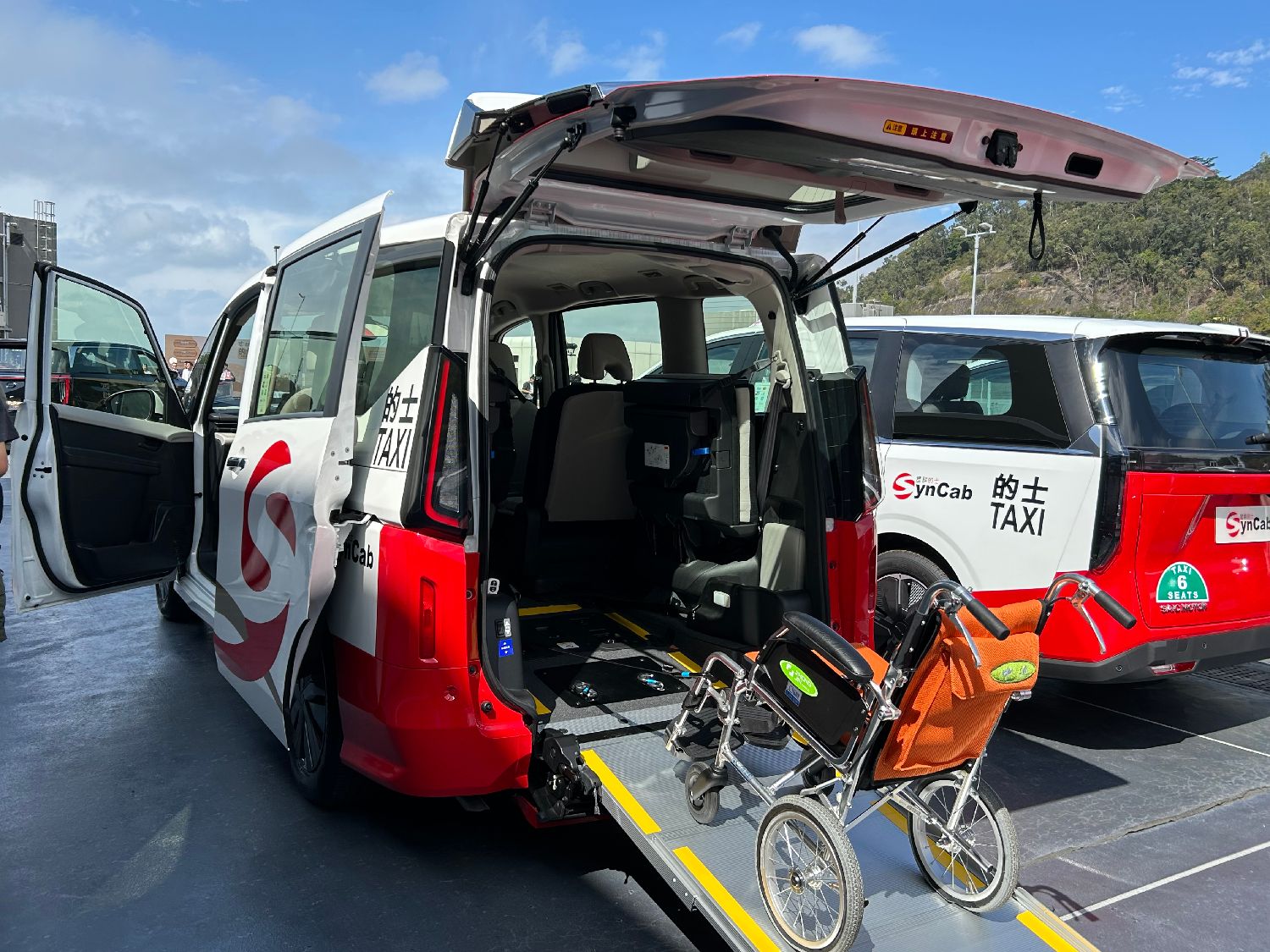 香港特区政府运输及物流局局长陈美宝(前)试坐“的士车队”车辆。中新社
