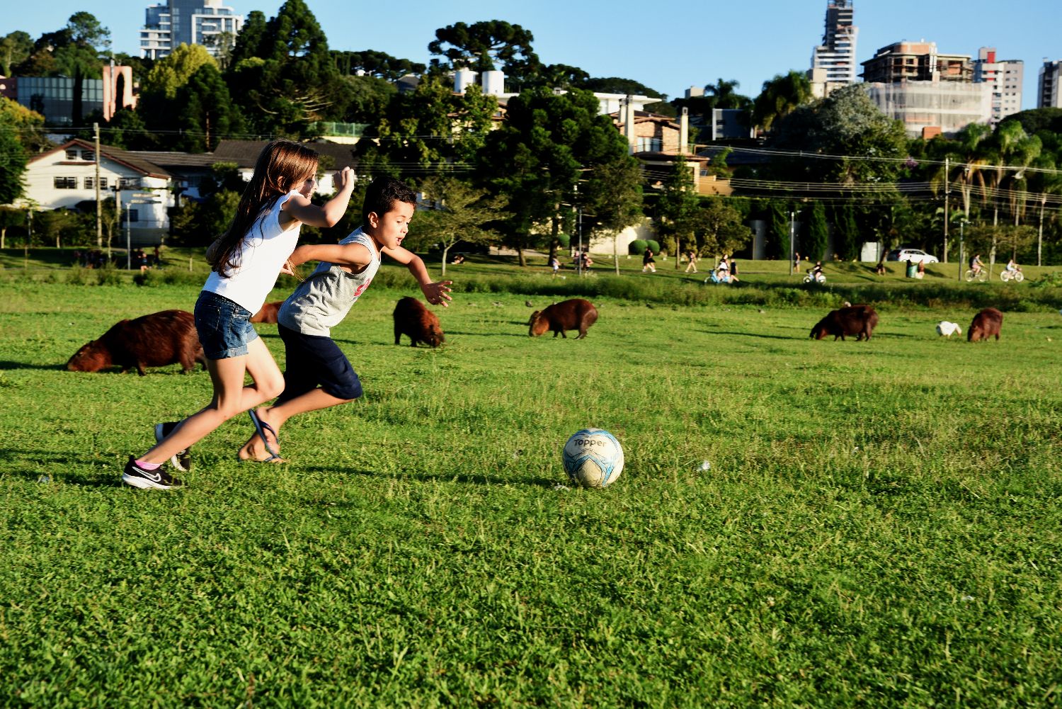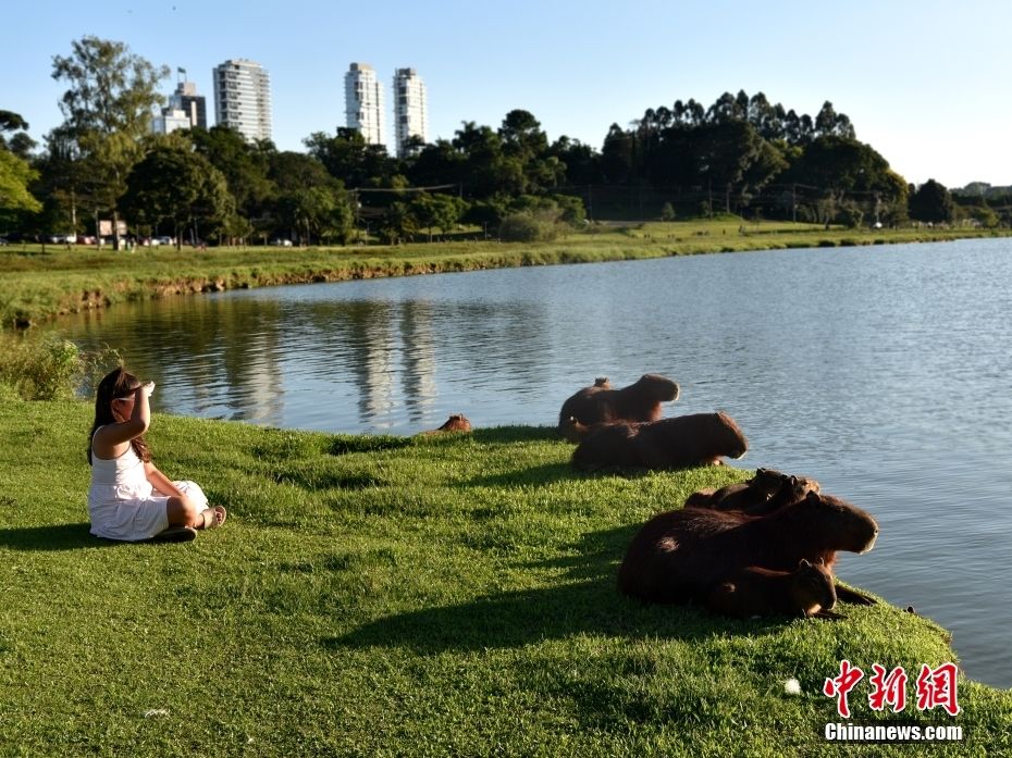 巴西库里蒂巴有“世界生态之都”的美誉,生态环境优渥,创意经济发达。图为当地时间3月3日,在巴西东南部巴拉那州库里蒂巴市巴里吉公园里,孩子在“卡皮巴拉”(capybara,水豚)栖息地玩耍。中新社