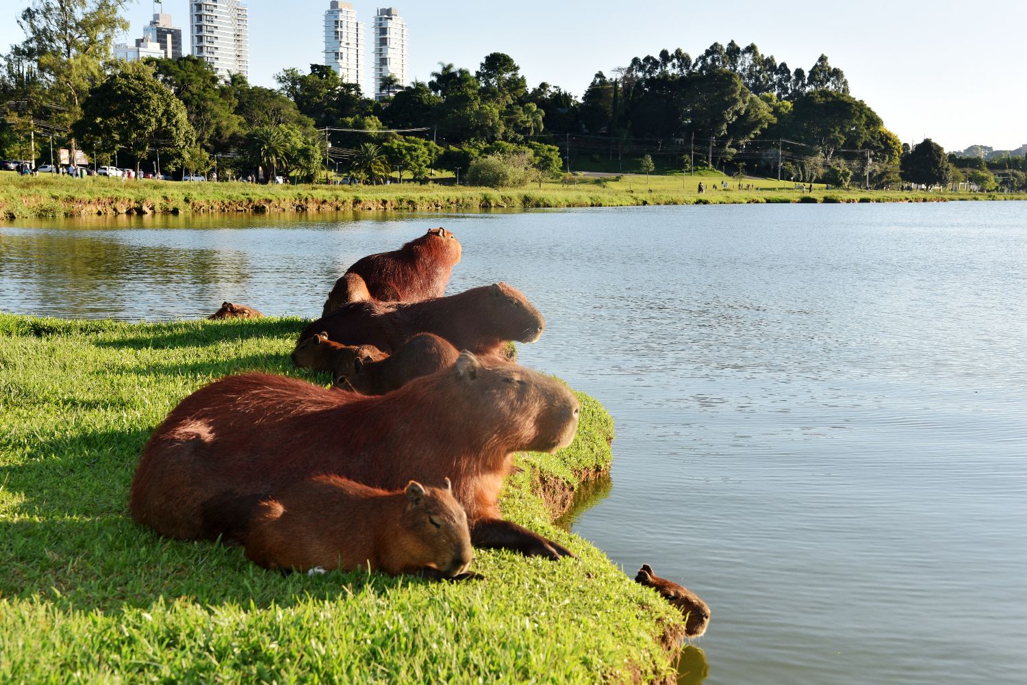 当地时间3月3日,巴西东南部巴拉那州库里蒂巴市巴里吉公园里,一群“卡皮巴拉”在湖边栖息。巴里吉公园是当地最大公园,以呆萌的卡皮巴拉族群受到游客热捧。中新社