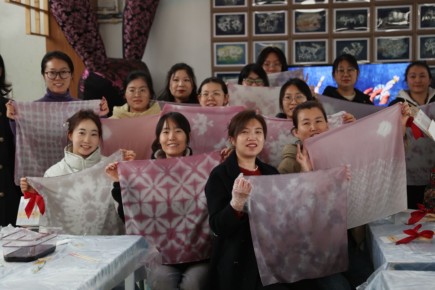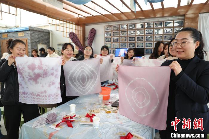 3月5日,市民们在宁夏银川一扎染工作室展示制作好的扎染方巾。中新网