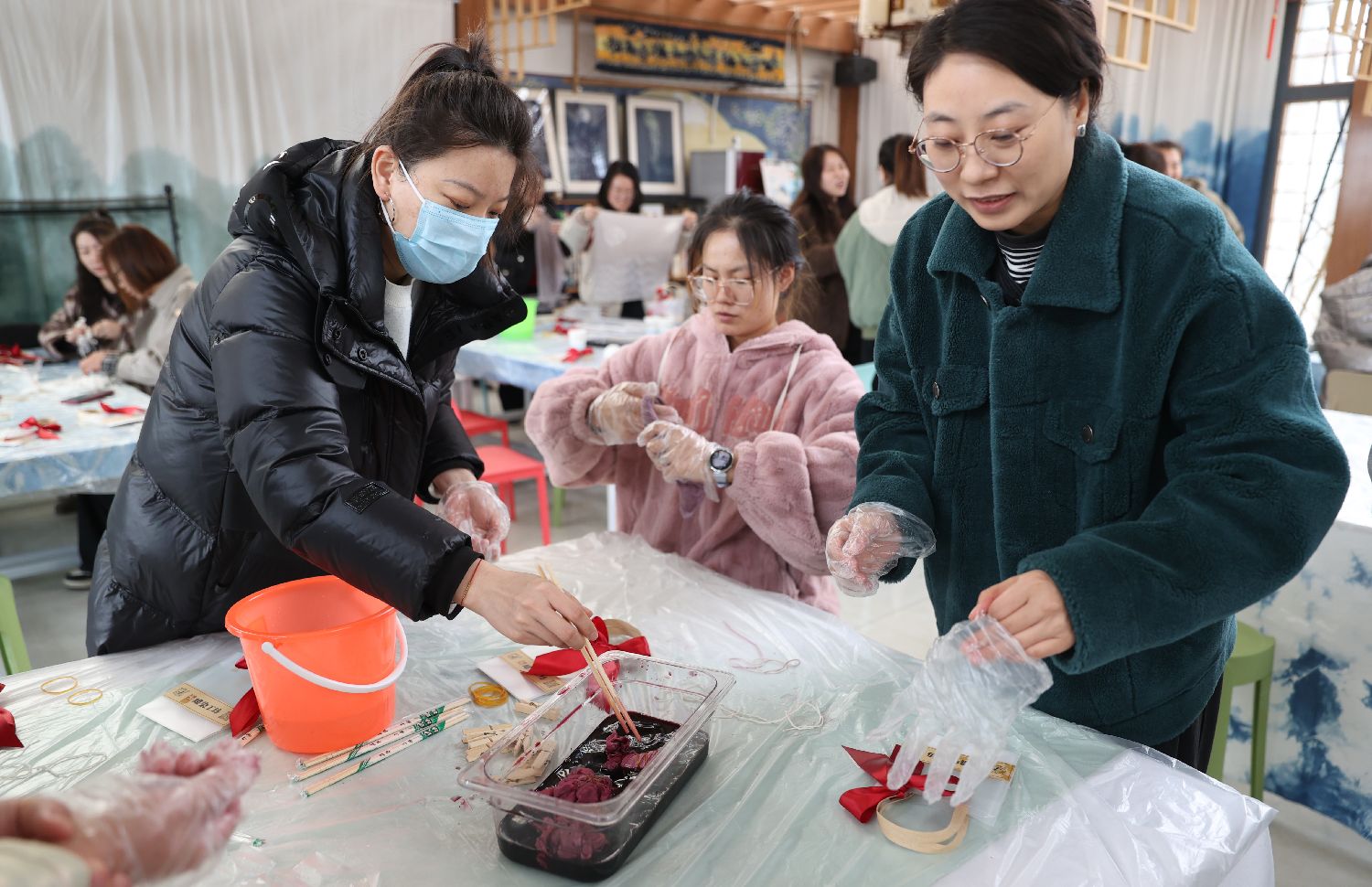 在扎染艺术中,红酒可以作为一种天然的染料来使用。利用红酒进行扎染,不仅可以赋予布料独特的色彩和质感,还能让人们在创作过程中体验到红酒与艺术的完美结合。图为3月5日,市民在宁夏银川一扎染工作室体验红酒扎染。中新社