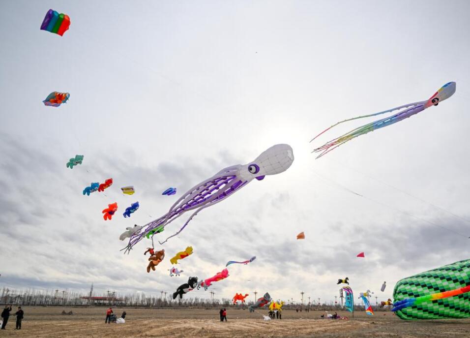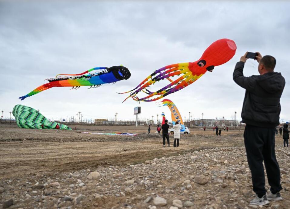 3月8日,新疆伊犁哈萨克自治州察布查尔锡伯自治县的都拉塔口岸迎来一场盛大的风筝文化艺术盛宴——“飞驰国门下 打卡都拉塔”2025首届风筝文化艺术节。来自全国各地的风筝爱好者同台竞技,展示融入国潮、国风等元素的各类风筝,场面蔚为壮观。图为当地群众拍摄放飞的风筝。