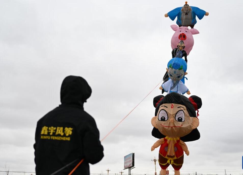 风筝爱好者放飞哪吒主题风筝。