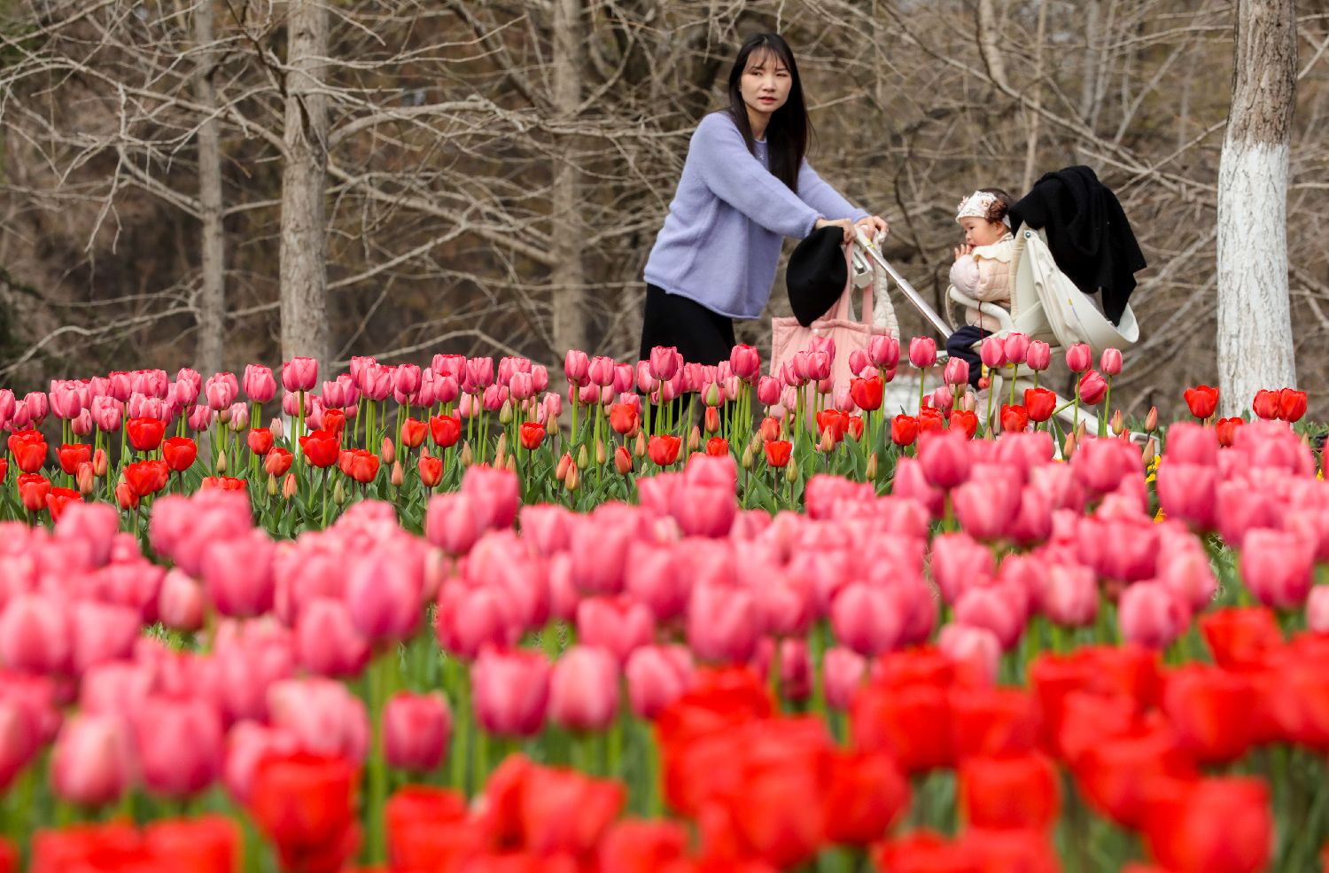 3月10日,重庆太寺垭森林公园内各色郁金香盛开,吸引游人踏春赏花。中新社