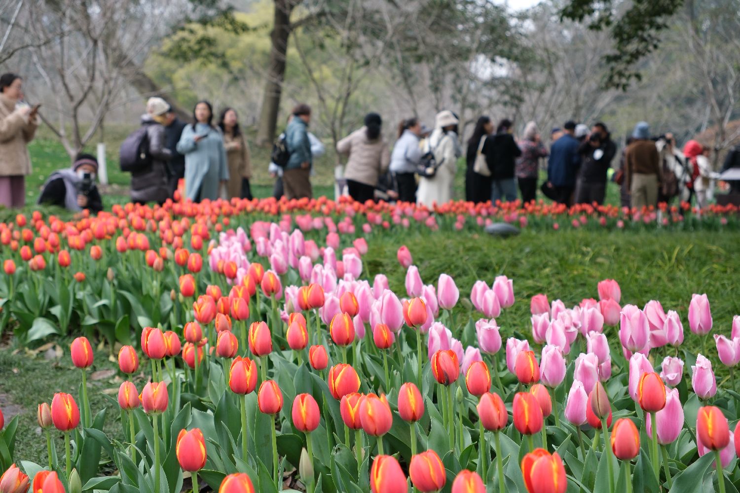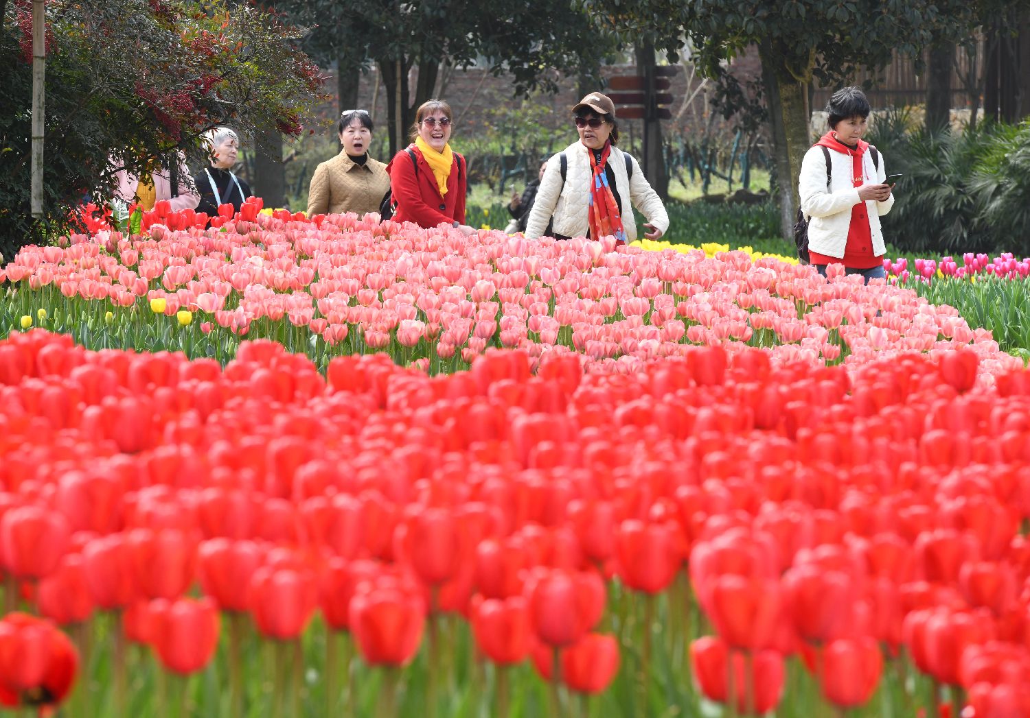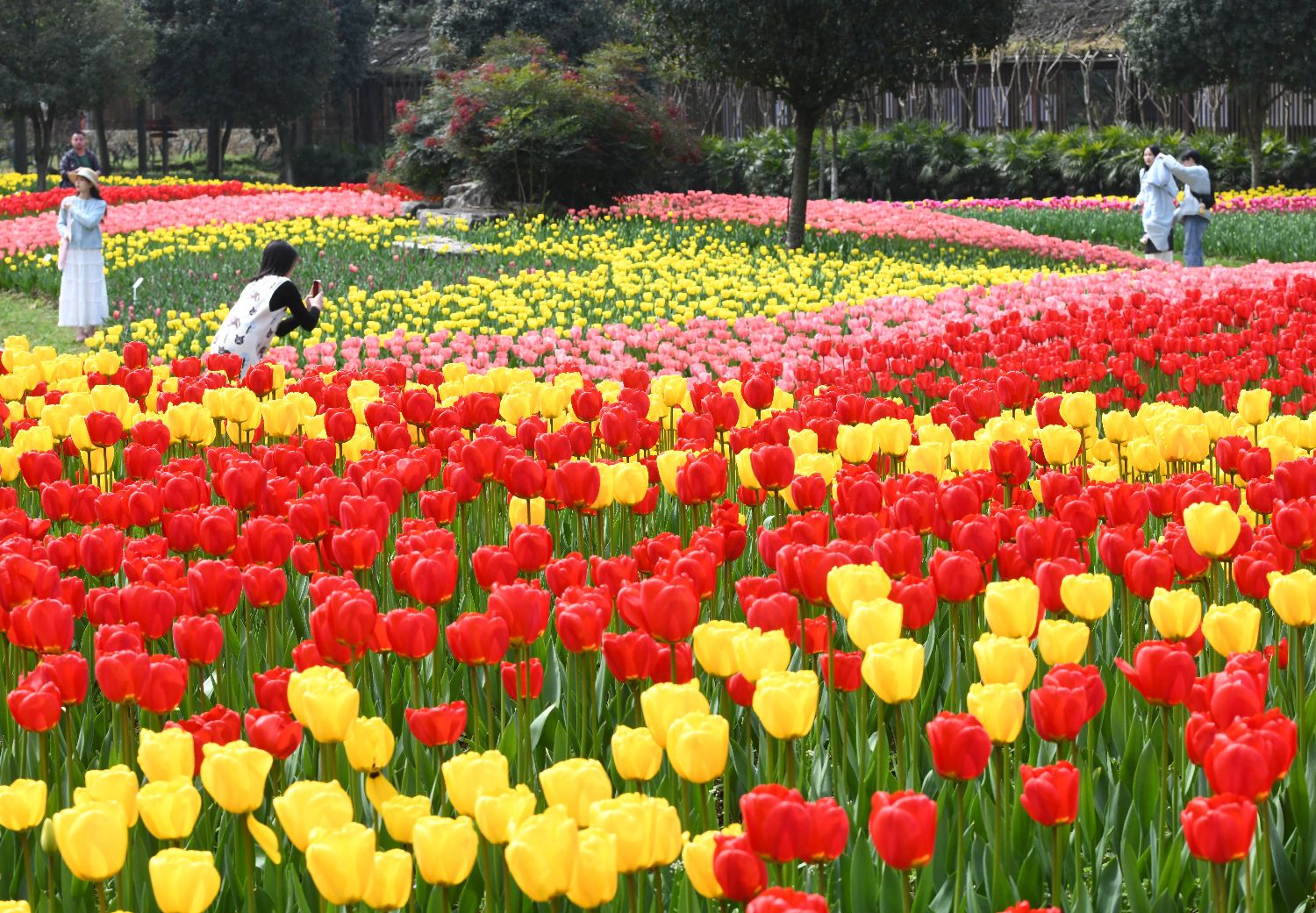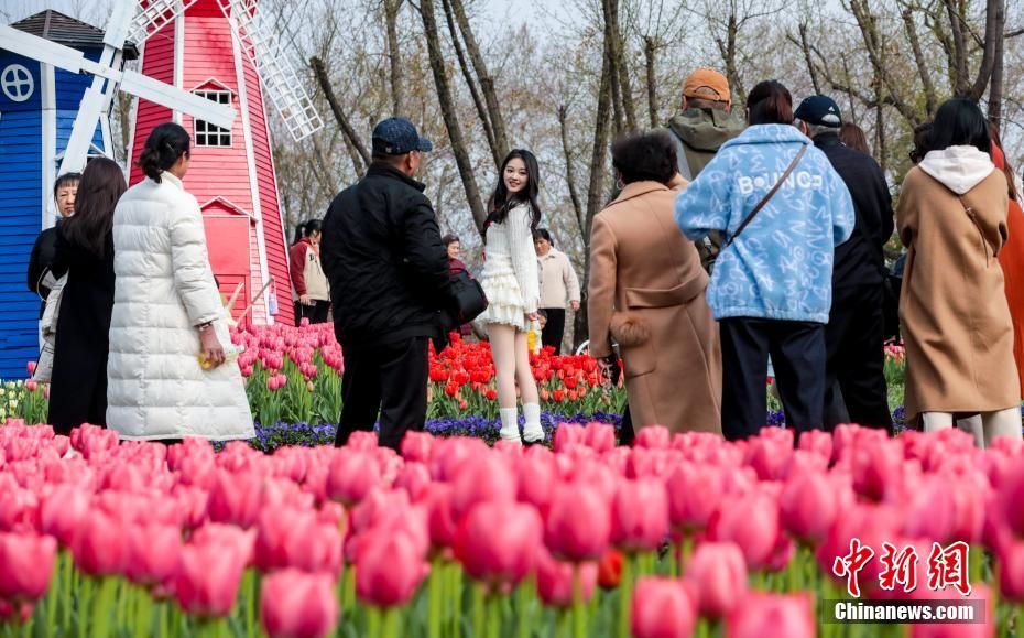 3月10日,市民在湖北武汉解放公园和郁金香合影。中新网