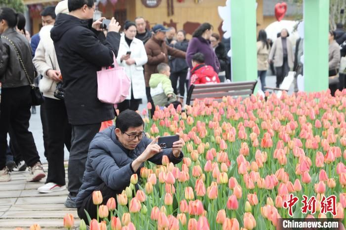 近日,四川达州宣汉县花仙谷郁金香花展活动举行,在花仙谷农旅园区内,数万株郁金香竞相绽放,如同大自然精心绘制的一幅绚丽画卷,吸引各地游客前来打卡拍照。图为3月10日,游人在园区内拍摄郁金香。中新网