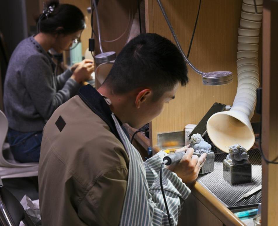 3月6日,在福建省工艺美术大楼寿山石雕刻工作间,两名青年雕刻师在雕刻寿山石。