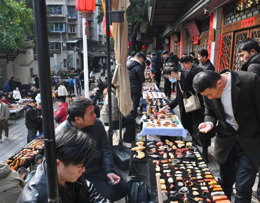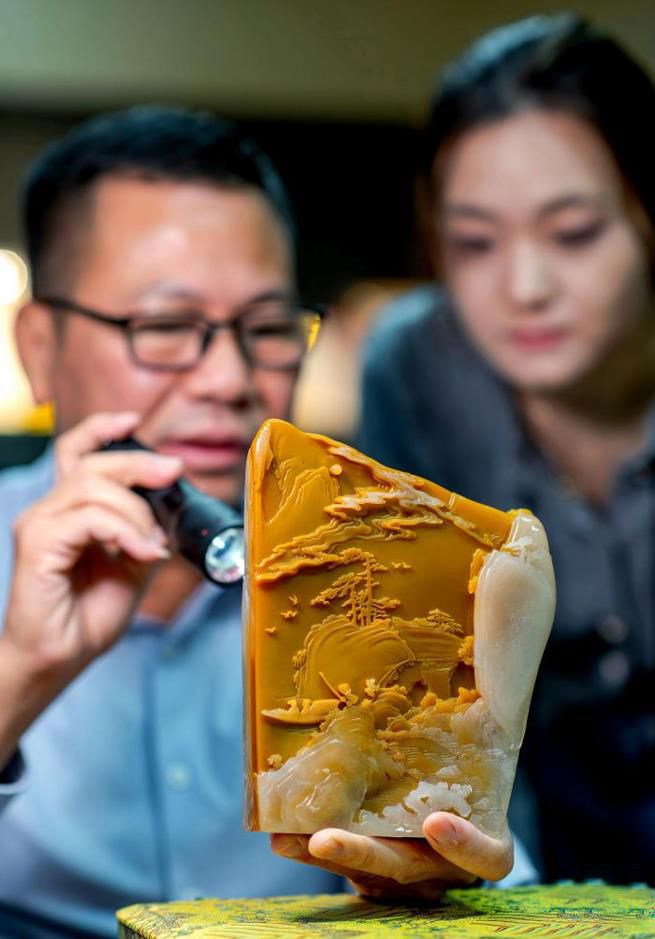 3月8日,寿山石爱好者在福州藏天园寿山石交易市场选购寿山石。