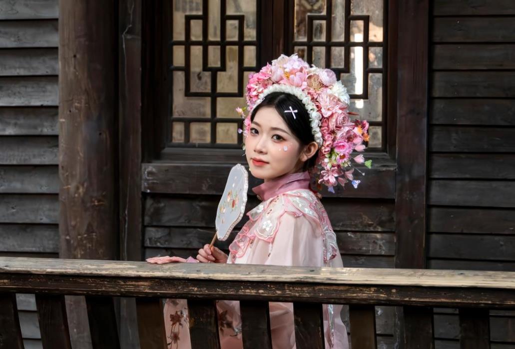 2月3日,一名游客头戴“簪花”在福州千年古街三坊七巷里打卡留影。