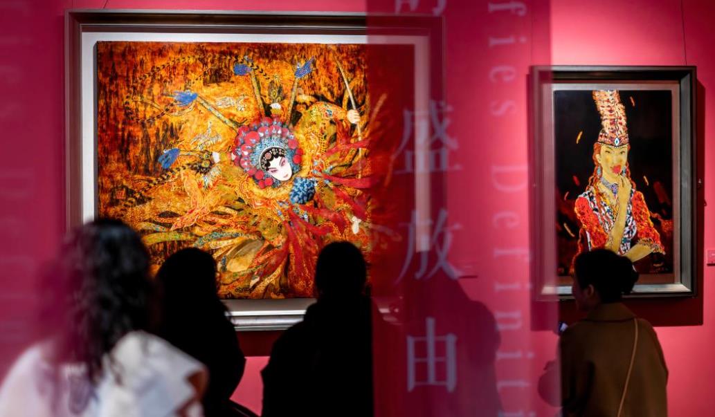 3月7日,观众在福建沈绍安漆艺博物馆里观赏女性题材的漆画作品。