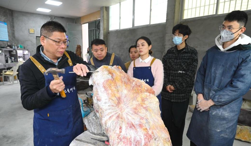 3月5日,中国工艺美术大师陈礼忠(左一)在给学生示范寿山石雕刻技法。