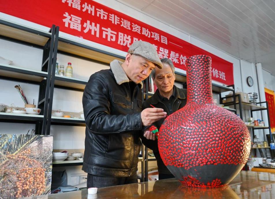 3月6日,福建省工艺美术大师陈天灨(右)在指导学生进行漆器髹饰技法。