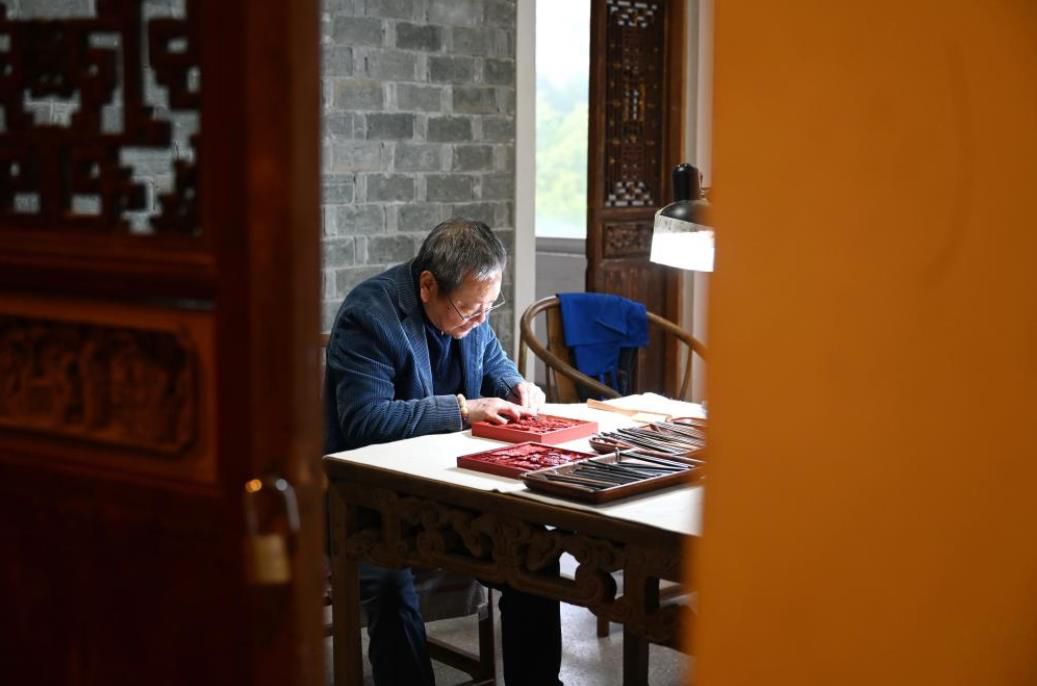 3月4日,中国工艺美术大师袁师永在进行雕漆创作。