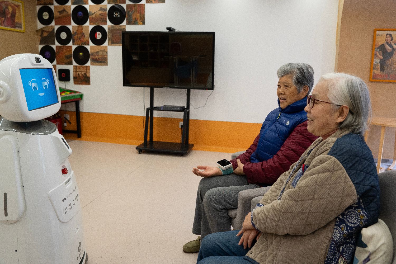 近日,浙江杭州多家社会福利中心和养老院“上线”了外骨骼设备、养老机器人等科技设备,助力智慧养老。图为3月12日,在杭州西湖区社会福利中心,养老机器人陪伴老人聊天。中新社