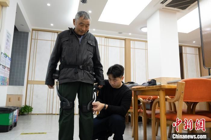 3月12日,在杭州西湖区留下街道的养老服务中心,工作人员为老人穿戴助行外骨骼设备。中新网