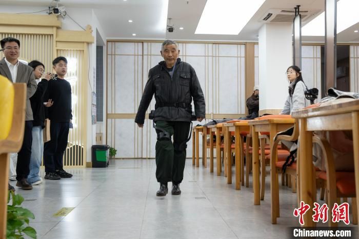 3月12日,在杭州西湖区留下街道的养老服务中心,老人体验助行外骨骼设备。中新网