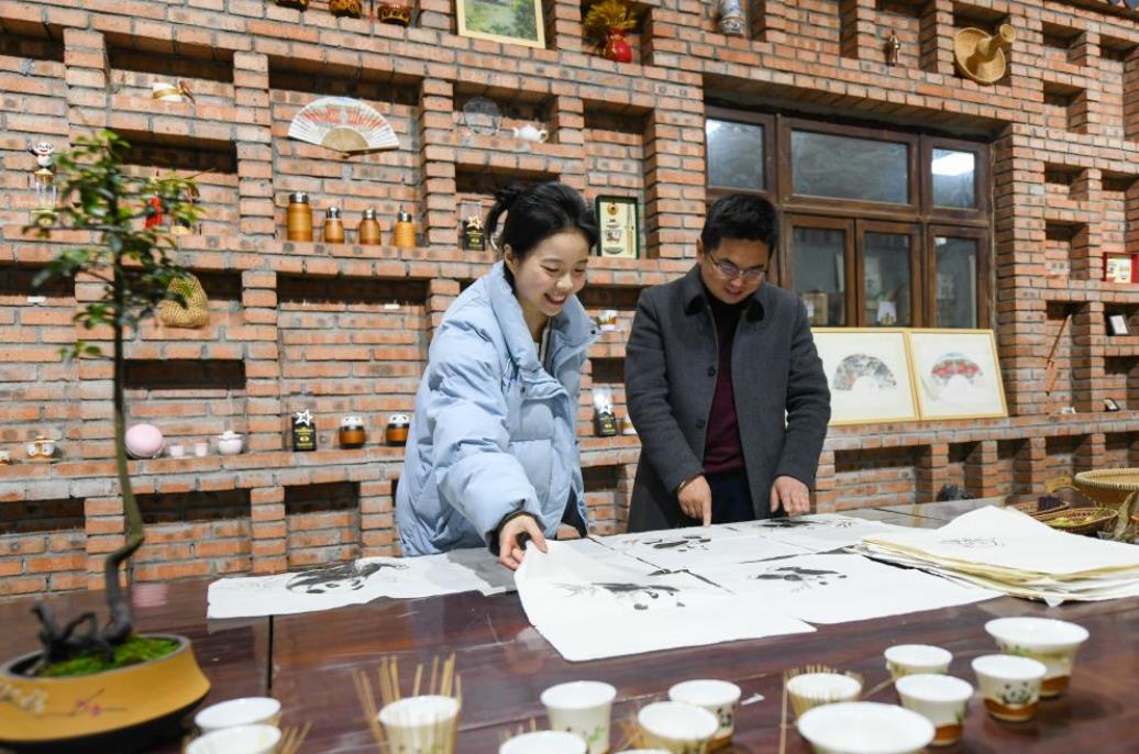 3月7日,在崇州市朱利原乡非遗文化园,白静波和女儿白梓忆在查看“熊猫抱竹”设计草图。白静波将国画风格的熊猫抱竹形象烧制于杯身,设计出一款具有四川地方特色的“熊猫抱竹”竹编盖碗。