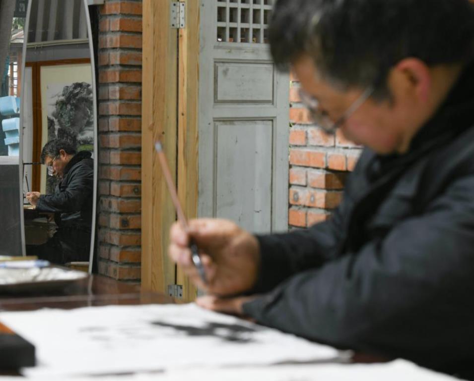 3月6日,崇州皮影戏非物质文化遗产传承人杨勇在绘制“熊猫抱竹”设计草图。