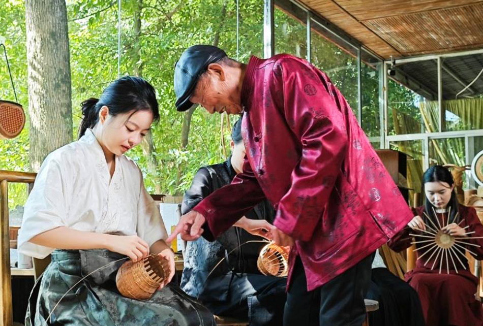 2024年10月27日,道明竹编国家级非遗代表性传承人赵思进(左二)在指导白梓忆(左一)编制竹罐。