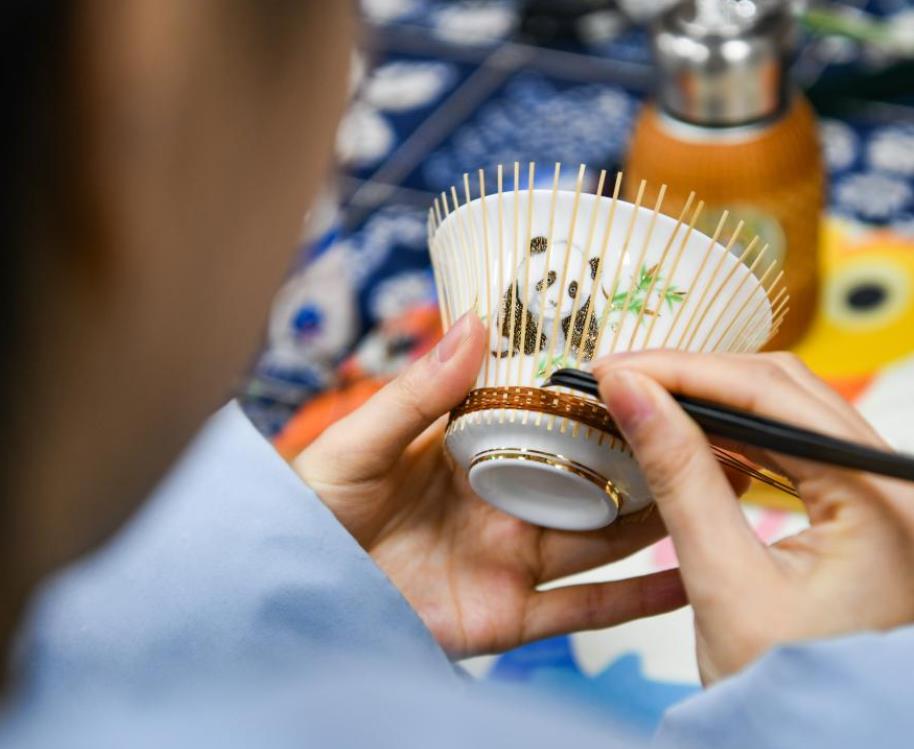 3月7日,白梓忆在编制“熊猫抱竹”盖碗茶杯。
