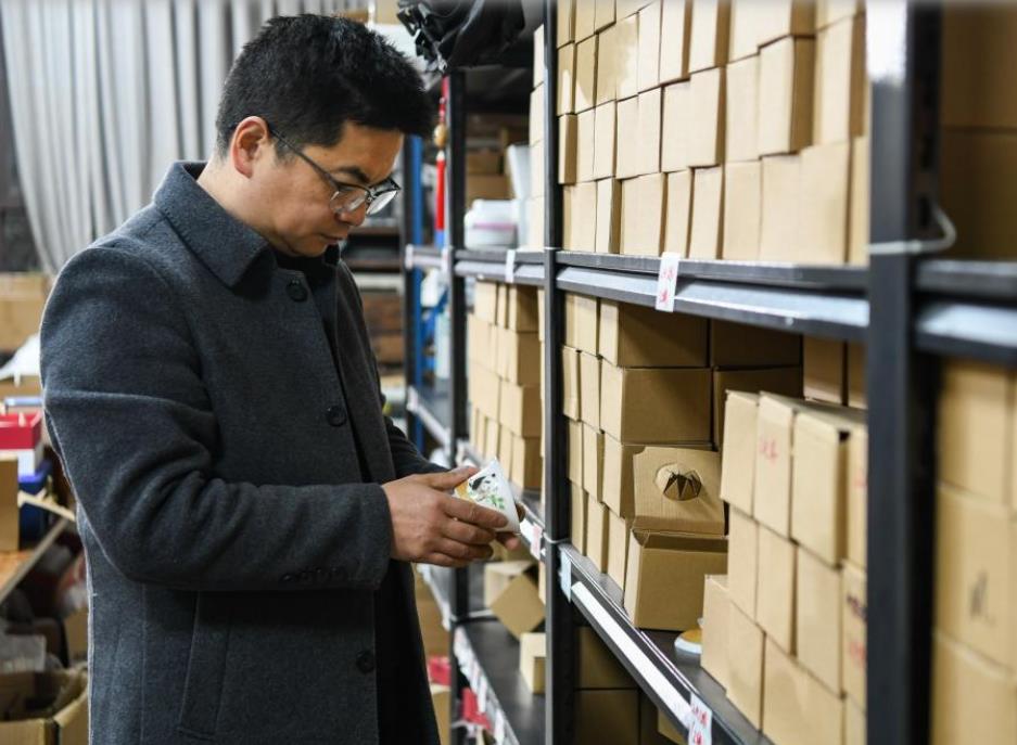 3月7日,白静波在库房查看即将入库的“熊猫抱竹”盖碗茶杯成品。