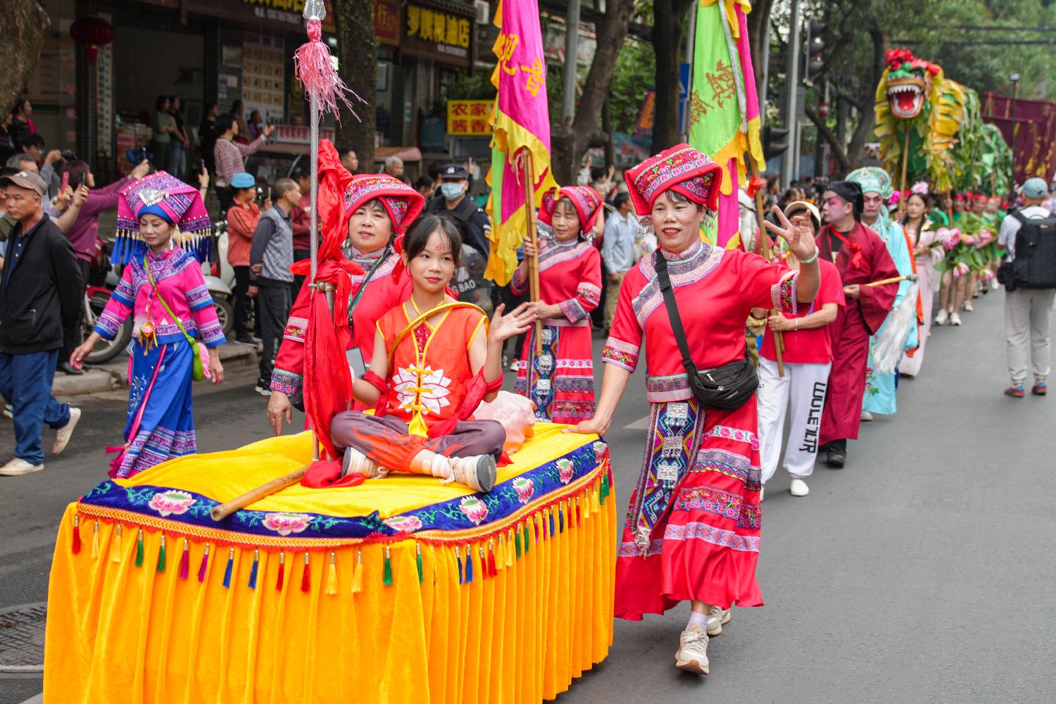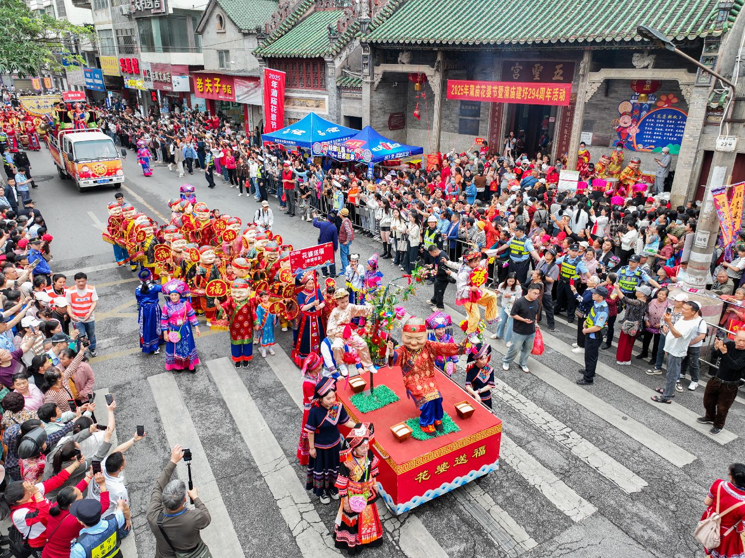 花婆送粥、花婆祈福、文艺演出、百家宴、放水灯……4月9日,一年一度的“花婆节”民俗活动在广西南宁邕宁区蒲庙镇热闹上演。相传很久以前,在蒲庙镇五圣宫对面的大众码头,有一位卖粥阿婆,她善良热心,总会送给路人一碗热粥喝。很多人喝过阿婆的粥后,不仅能消除疲劳、祛病健身,还能沾上福气。人们不知道阿婆叫什么名字,见她爱戴花,因此尊称她为花婆。图为大巡游活动现场。中新社