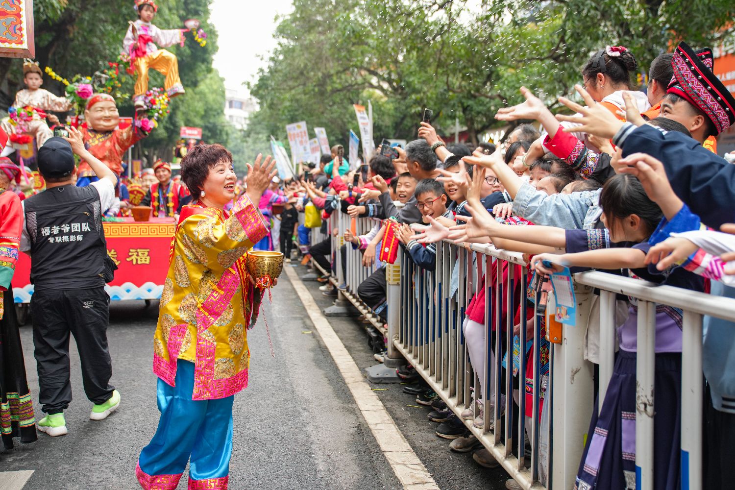 花婆节传承文化协会会长、广西壮族自治区级非物质文化遗产代表性传承人张月珍巡游时向民众撒福米。中新社