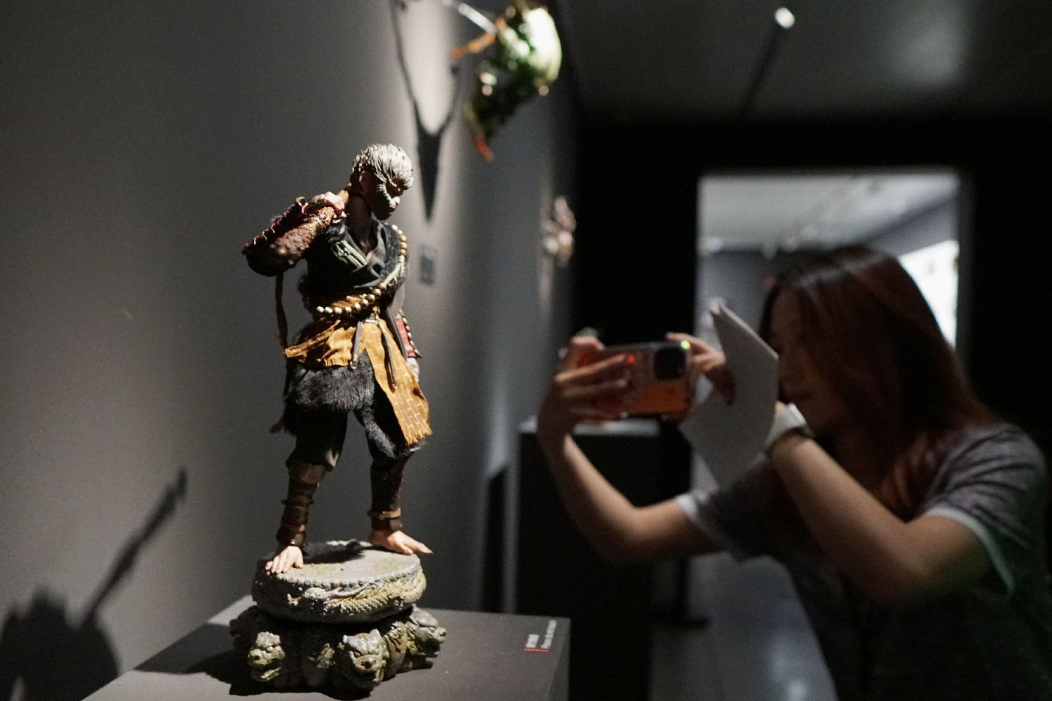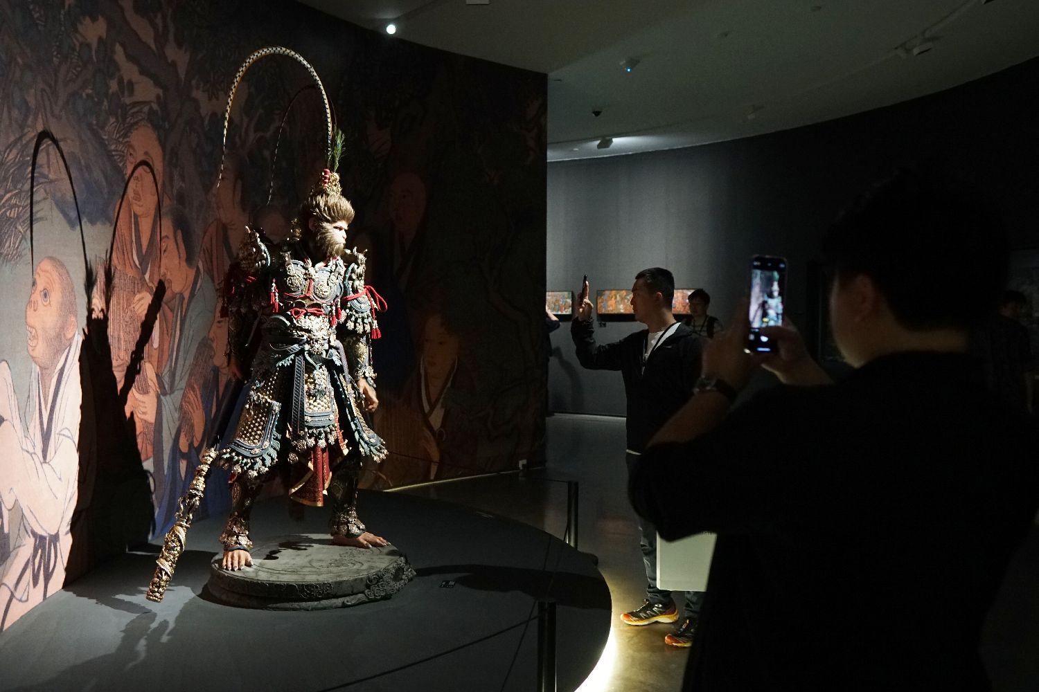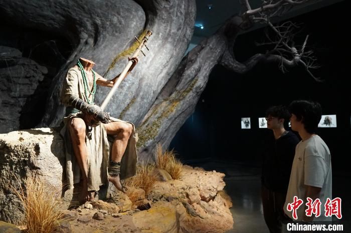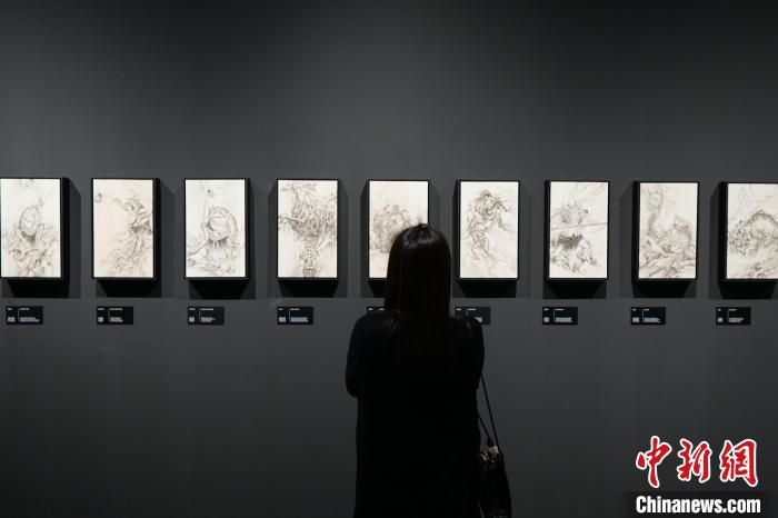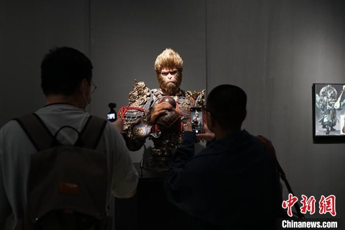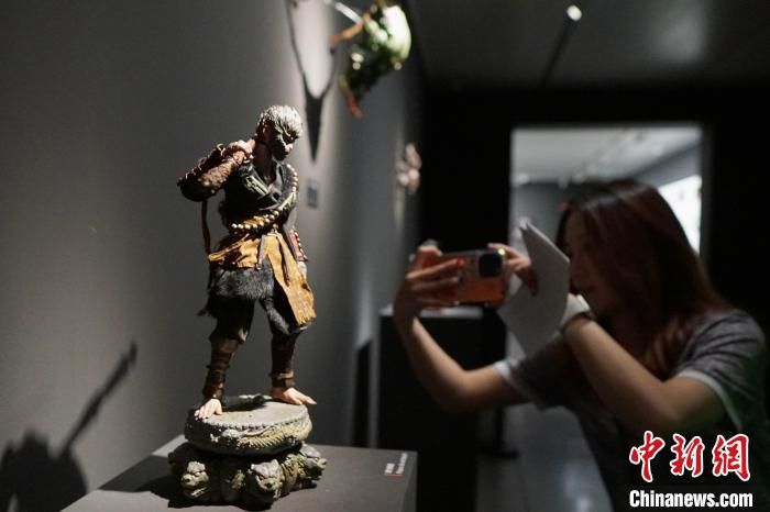 4月9日,“黑神铸炼”——「黑神话:悟空」主题艺术展在浙江杭州中国美术学院美术馆开幕,展出400多幅原画作品、200多件实物等。展览将持续至5月21日。图为参观者在“天命人”全身像前拍照。中新社