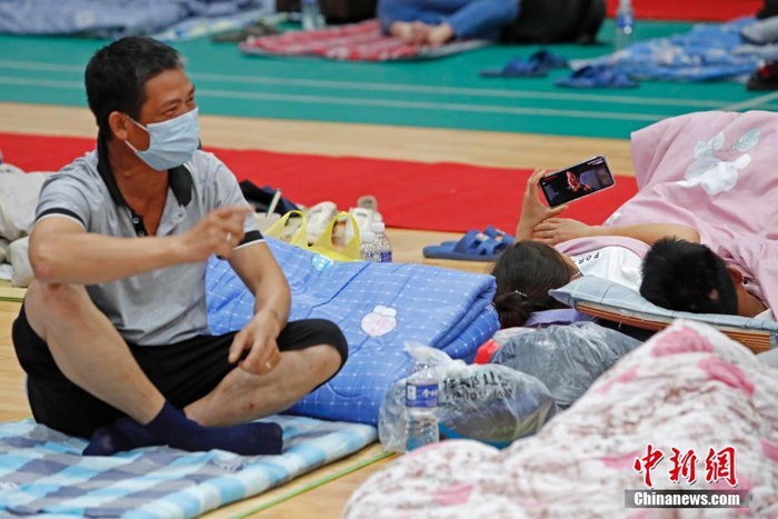 9月13日,今年第14号台风“灿都”裹挟着狂风暴雨,逼近长三角沿海地区,上海、浙江多地停课、停运。截至13日18时,上海累计转移安置33.1万人。图为9月13日晚,市民在上海电机学院临港校区体育馆内休息。