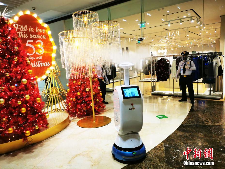近日,菲律宾疫情趋缓,11月2日确诊病例下降至2303例,为8个月来新低。一些商场开始延长营业时间。图为2日,菲律宾大马尼拉地区BGC环球城一商场延长营业时间,开始圣诞促销,同时使用机器人巡店消毒。