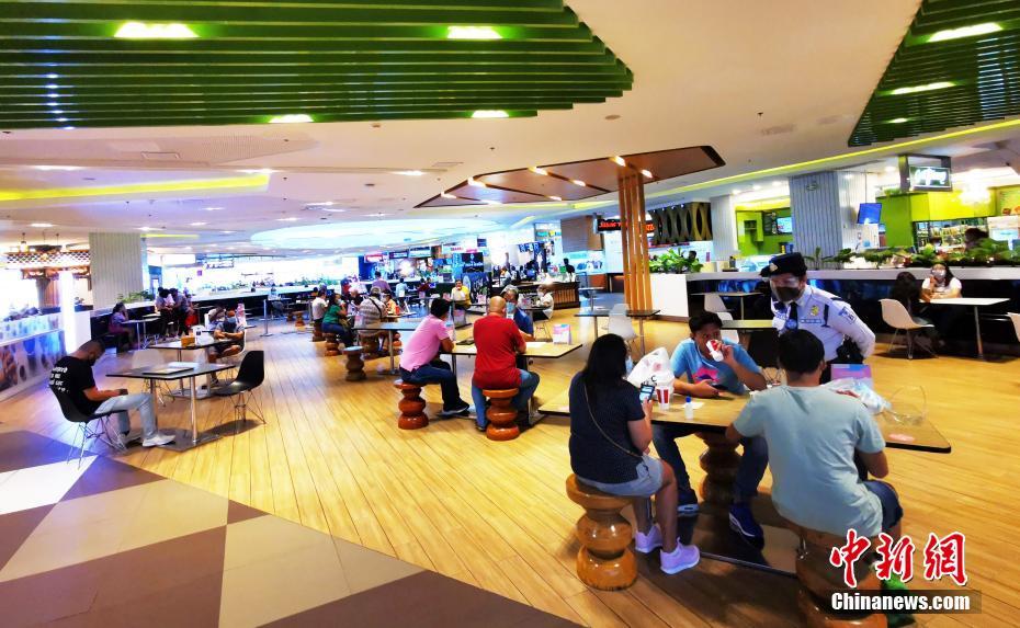 2日,菲律宾大马尼拉地区BGC环球城一商场美食摊档恢复营业,保安人员提醒食客注意保持社交距离。