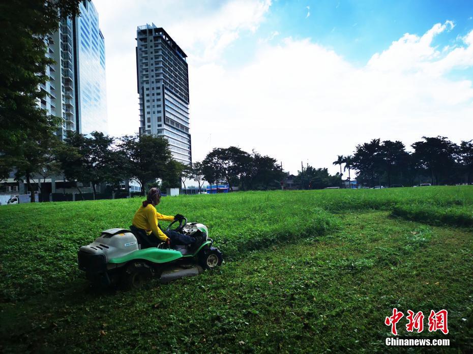 2日,BGC环球城环卫工人修剪草坪整理社区环境,迎接圣诞新年季。