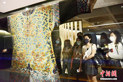 11月3日下午,香港艺术馆举行“物色—馆藏文物的色彩美学”新闻界预展,介绍展览内容和重点展品。展览以颜色为主题,展出300多件香港艺术馆的中国文物藏品,带领观众走进古代文物缤纷的色彩世界。图为中国古代具象征意义的色彩服饰藏品展示。