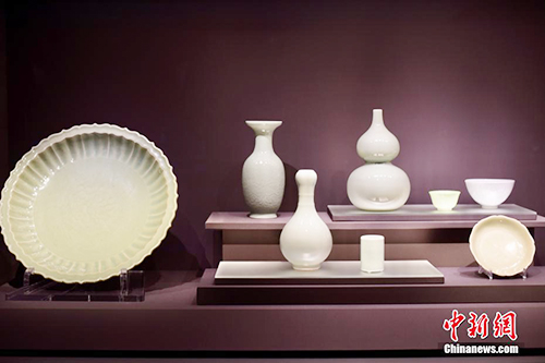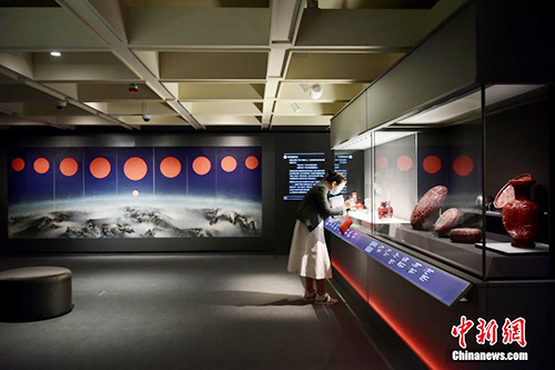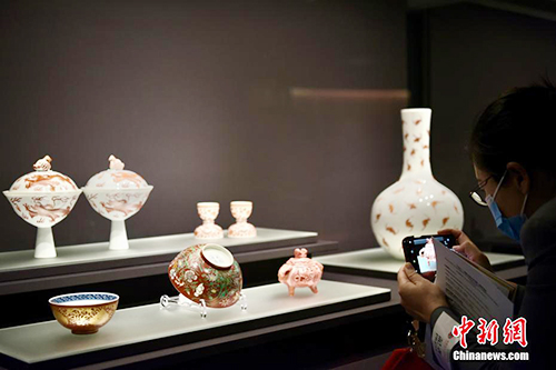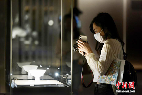 11月3日下午,香港艺术馆举行“物色—馆藏文物的色彩美学”新闻界预展,介绍展览内容和重点展品。展览以颜色为主题,展出300多件香港艺术馆的中国文物藏品,带领观众走进古代文物缤纷的色彩世界。图为现场人士参观展览。