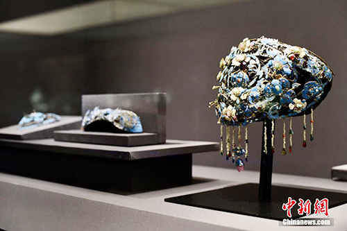 11月3日下午,香港艺术馆举行“物色—馆藏文物的色彩美学”新闻界预展,介绍展览内容和重点展品。展览以颜色为主题,展出300多件香港艺术馆的中国文物藏品,带领观众走进古代文物缤纷的色彩世界。图为中国古代青色藏品,点翠嵌宝石珍珠蝠蝶花卉钿子。