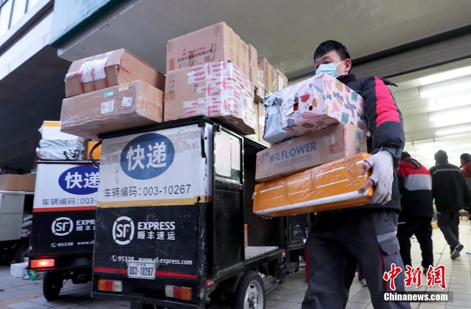 11月11日,北京顺丰速运中关村营业部快递小哥将快递装车,准备派件。中新社