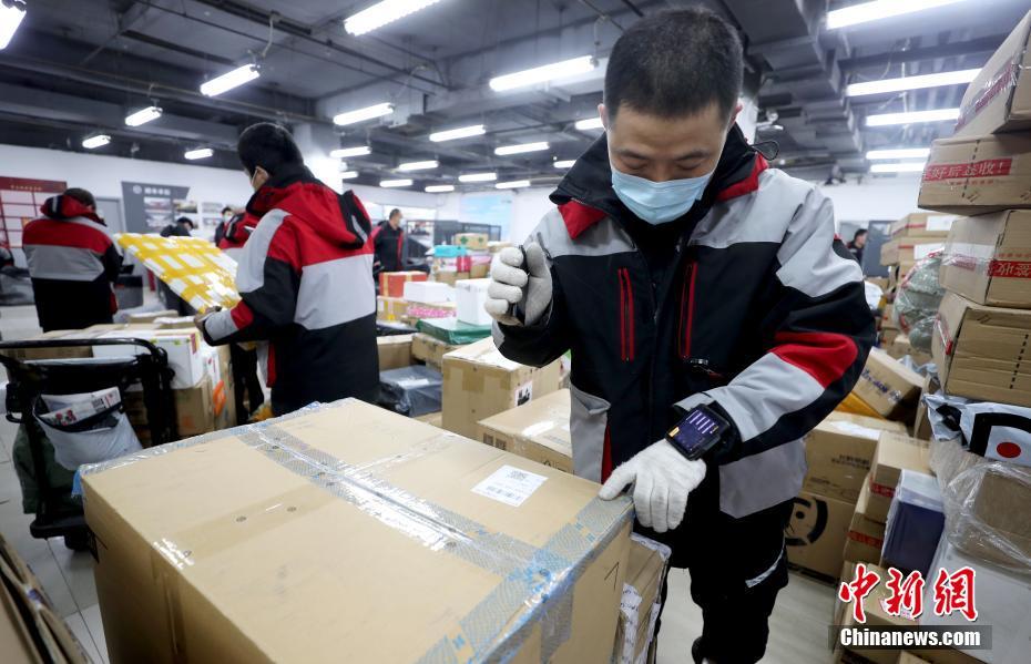 11月11日,北京顺丰速运中关村营业部快递小哥使用可穿戴的移动收派件终端分检快递。中新社