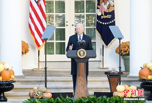 当地时间11月19日,美国总统拜登在白宫玫瑰园“赦免”2021年感恩节“幸运”火鸡——“花生酱”(Peanut Butter)和“果冻”(Jelly)。 图为拜登在火鸡“赦免”仪式上讲话。