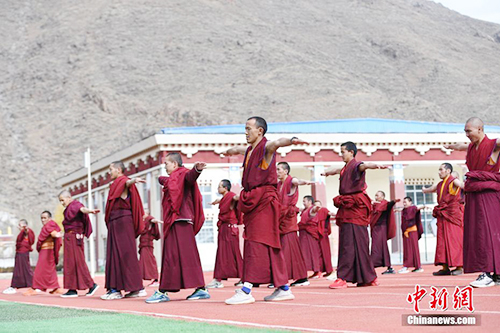 11月19日,西藏佛学院成立10周年庆祝活动在西藏自治区拉萨市曲水县聂当乡西藏佛学院隆重举行。西藏佛学院办学10年来,已为西藏自治区各寺庙培养毕业学员1335人,培训僧尼2640人。图为西藏佛学院学员正在上体育课。