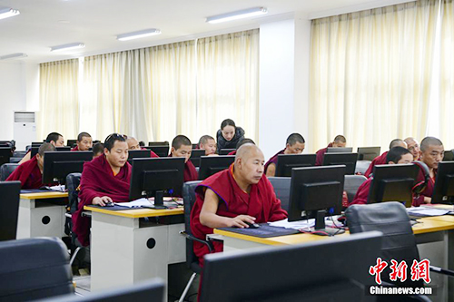 11月19日,西藏佛学院成立10周年庆祝活动在西藏自治区拉萨市曲水县聂当乡西藏佛学院隆重举行。西藏佛学院办学10年来,已为西藏自治区各寺庙培养毕业学员1335人,培训僧尼2640人。图为西藏佛学院学员正在上计算机课程。