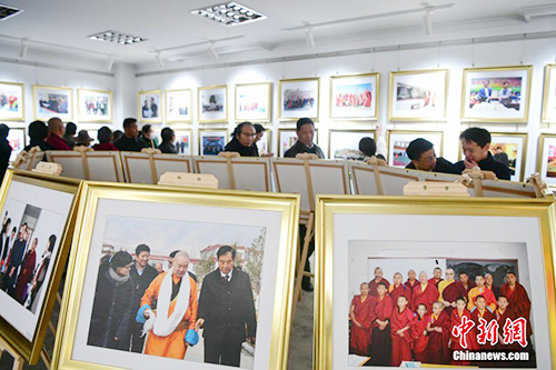 11月19日,西藏佛学院成立10周年庆祝活动在西藏自治区拉萨市曲水县聂当乡西藏佛学院隆重举行。图为教职工代表参观西藏佛学院成立10周年摄影展。