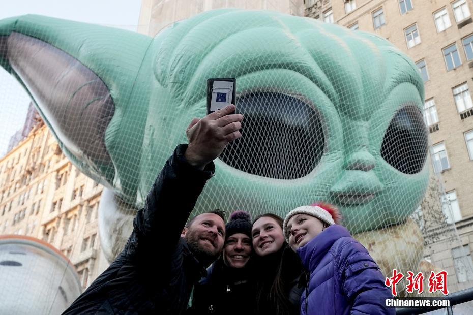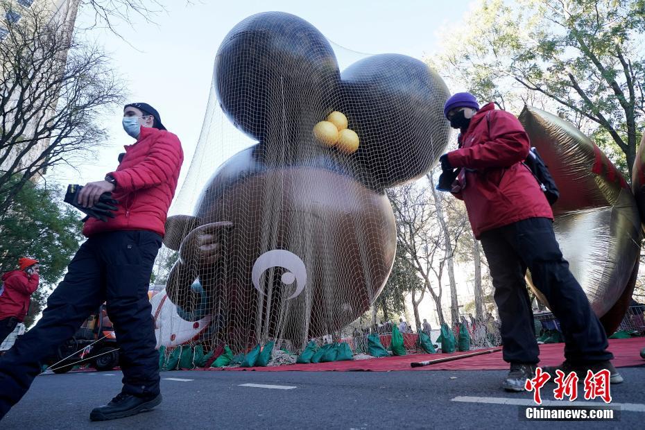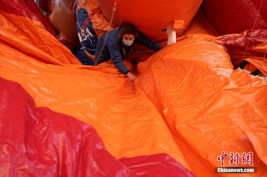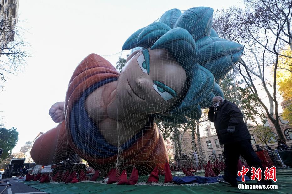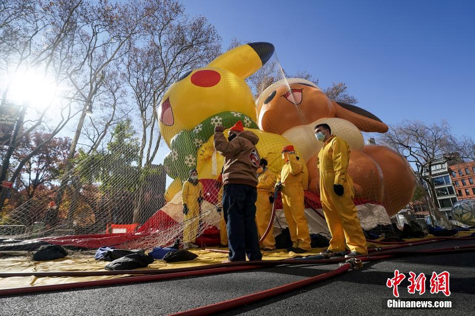 11月24日,在美国纽约曼哈顿街头,梅西百货员工为即将到来的第95届感恩节大巡游做准备工作,多款卡通形象气球亮相。图为工作人员为气球充气。