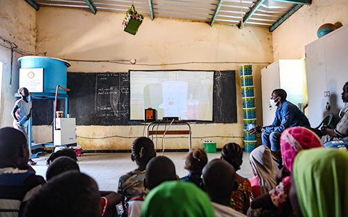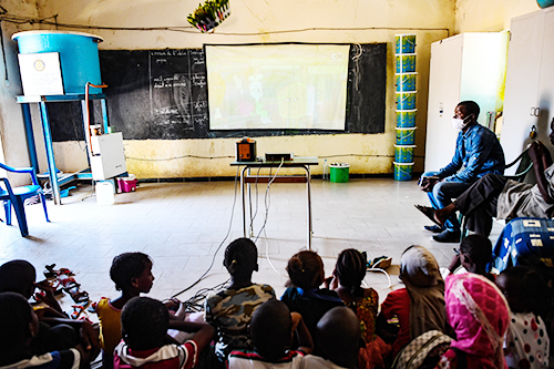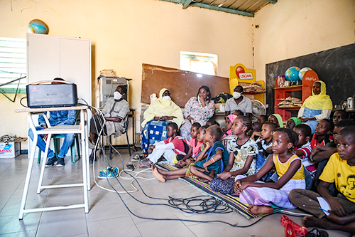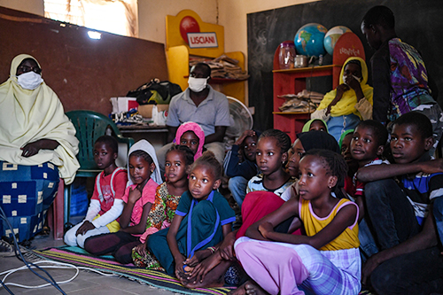 11月22日,在塞内加尔达喀尔近郊的辛迪亚小学,同学们课间坐在教室的地毯上观看投影播放的动画片。